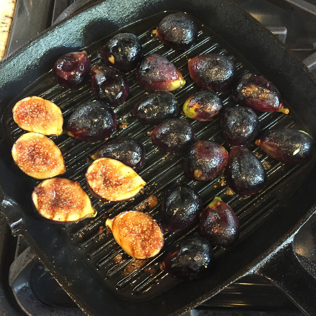 2. Place the fix in a pan (insides down) let them start sizzling. Flip them over after a minute or two and get the other side nice and sizzly too. These figs will let off a lot of juice. You can use that to dress your salad so dont throw it away.