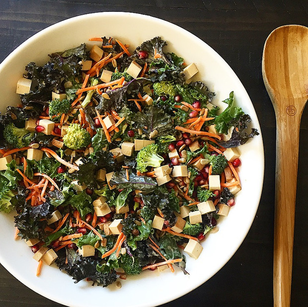 2. Add dressing and toss with your hands massaging it into your kale to tenderize it a little bit. This is a great salad to make ahead of time because the kale only gets better and better as it sits in the sauce. I love to use any kind of Asian dressing because it will most likely have a rich sesame or miso flavor & some sweetness which balances great with the sometimes bitter leafy greens.
