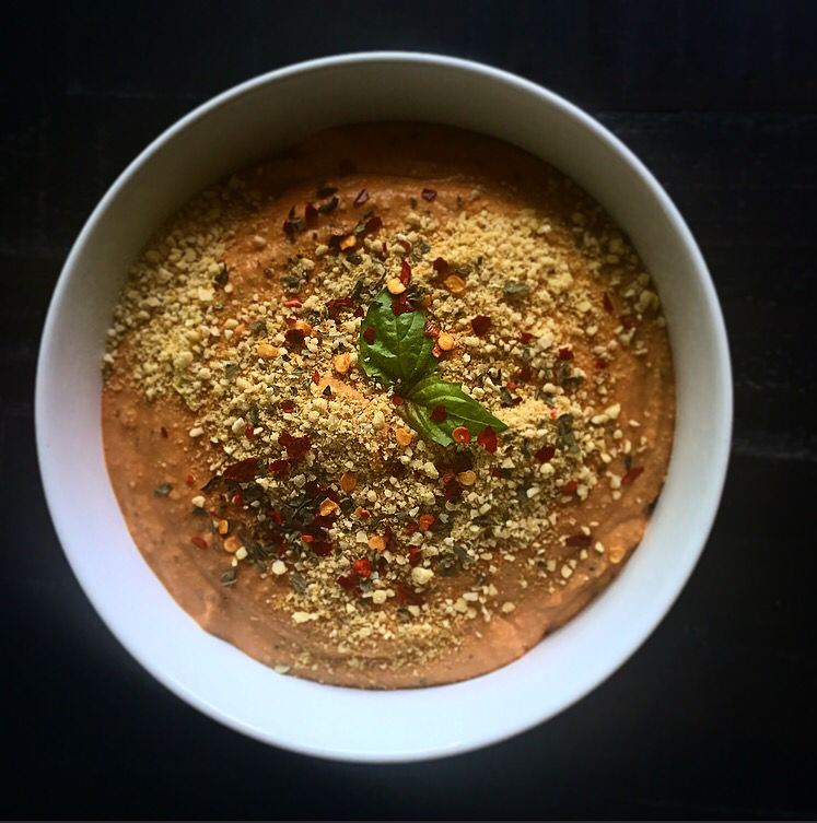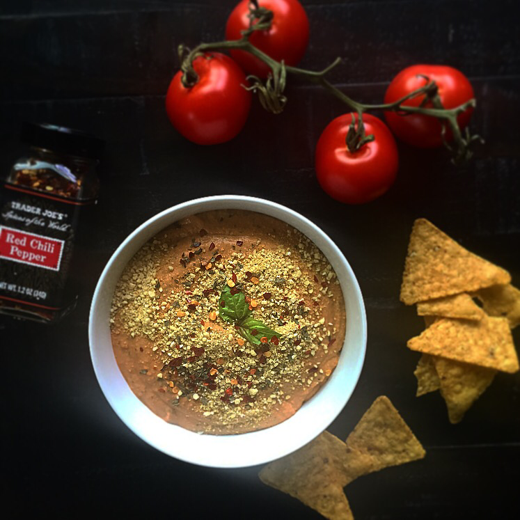 So, in the middle of the night during a really lovely dream about me and my Vegan Parm, the idea hit me to make PIZZA HUMMUS!!! And boom just like that, my new favorite condiment was born. I am planning on spreading this on everything, but it was also a super snack when I saw I had some tortilla chips in the cupboard. I have way too much fun in the kitchen. I literally walked around the house and dipped whatever I could in this and I swear EVERY THING worked. Ummm… I also “tasted” several tablespoons just right out of the bowl into my belly and it was pretty fab that way too. No judgement.