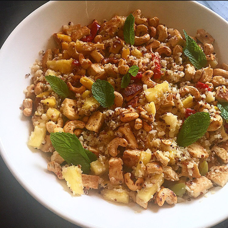 What’s a girl to do when she’s trying to watch her carbs but all she can think about is Thai Food. Well there are several options, including “screw the diet, treat yo’self” but last night I chose the low road, low carb that is. I made this delicious Pineapple Fried Rice using a nice mix of Cauliflower Rice + Quinoa and I’m so glad I did. This dish was delish! Everyone enjoyed it so much and nobody felt like they were lacking on anything. So let’s get healthy, let’s get to it, let’s get cooking!