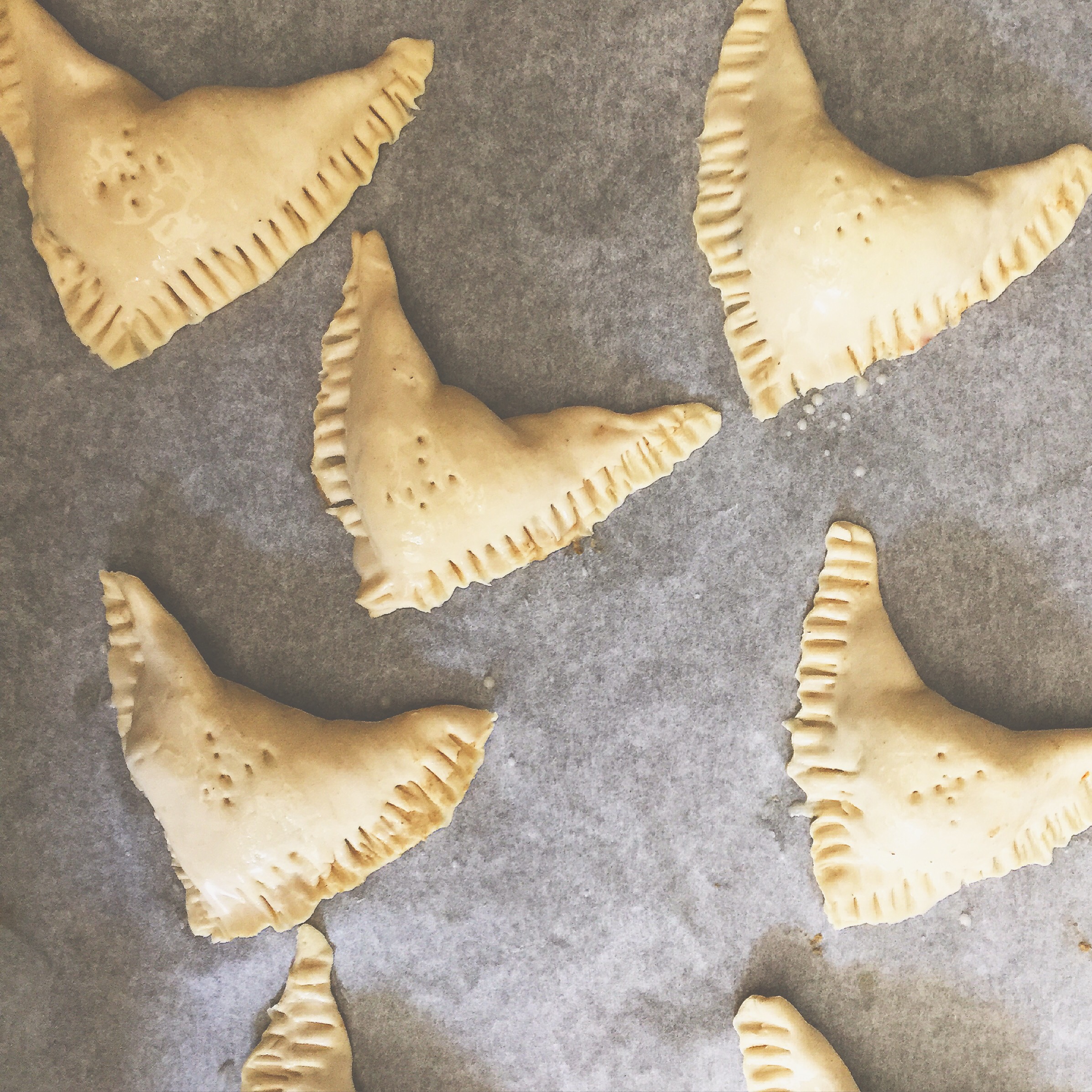 7. Put 1 tablespoon of your filling in the middle of each square and fold over to a triangle shape, sealing the sides very well. Transfer triangles to baking sheet and line up leaving room between each one. Use a fork to press down the sealed ends.