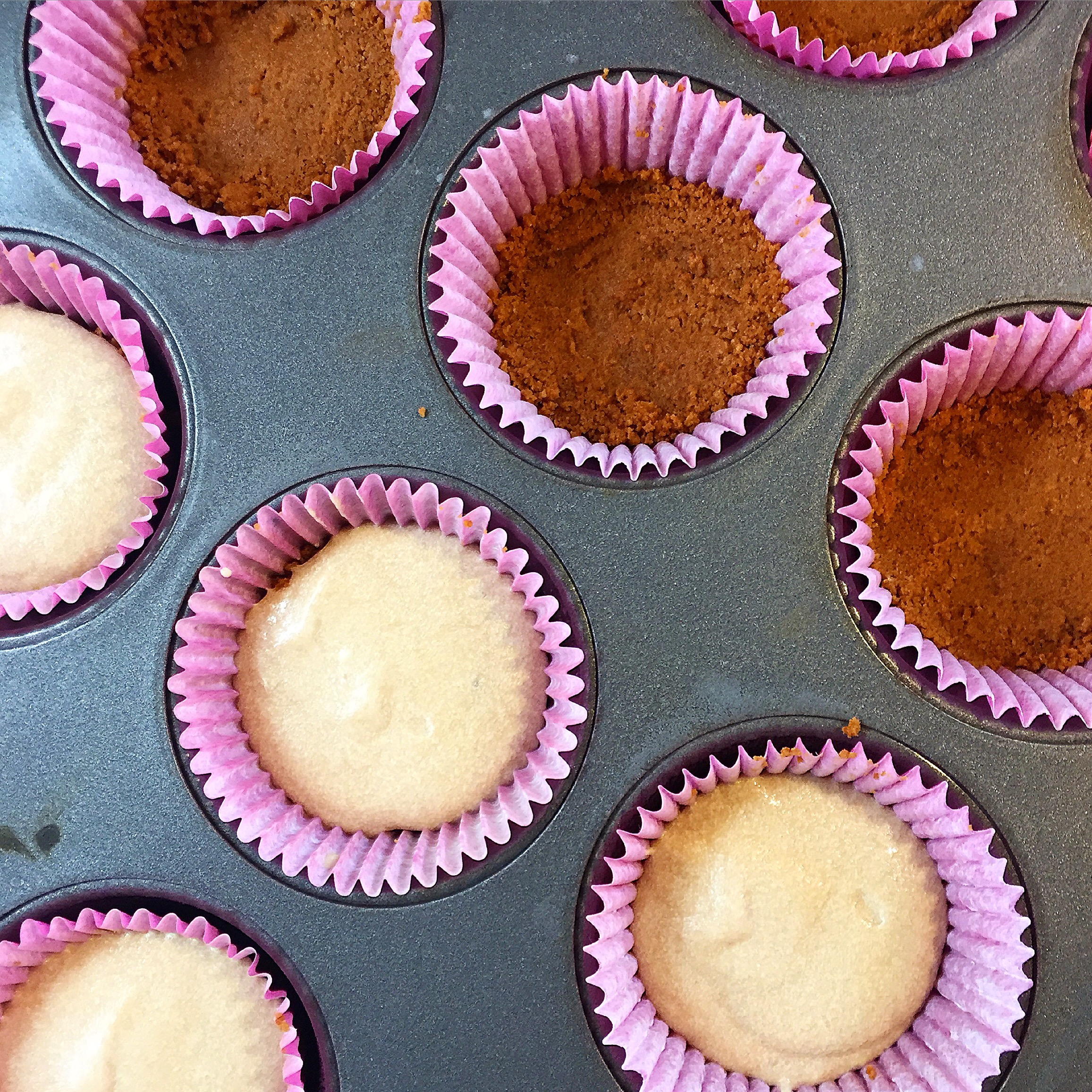 5. Take 1 tablespoon of crust mixture and press lightly to cover the bottom of the cupcake liner. Repeat.