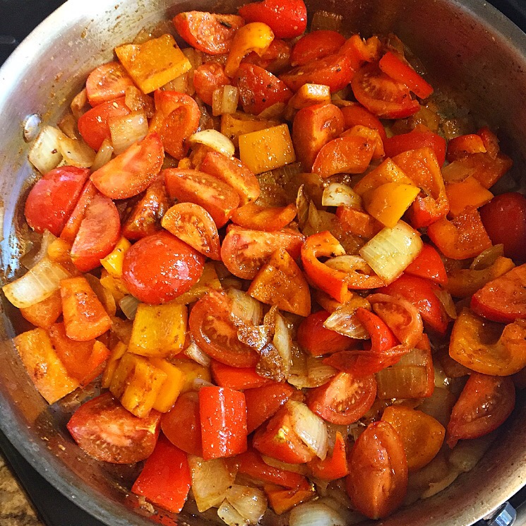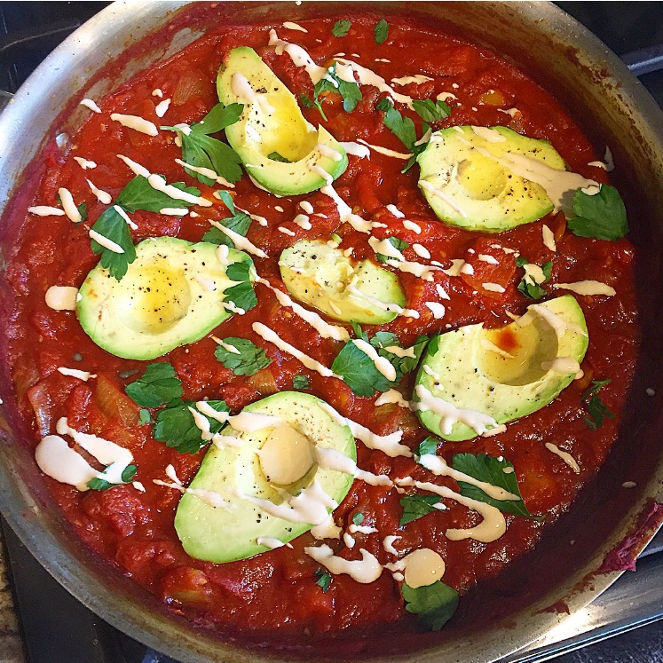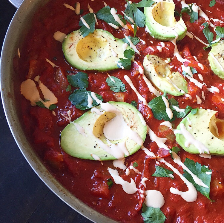 1 large yellow onion 1 tablespoon crushed garlic (2 cloves) 2 bell peppers (red or orange) 7 – 8 pearl tomatoes 1 large can crushed Roma tomatoes (unsalted) 1 small can tomato paste 3 avocados Smoked Paprika Turmeric Cumin Cayenne pepper Sea salt Pepper Juice of half a lemon 3 tablespoons olive oil Garnish: fresh parsley, Tahini, & Black Salt Directions: 1. In a large pot bring olive oil to a medium heat. You will never turn the heat up higher than medium. 2. Add onions and sauté/sweat them until they become translucent. 3. Add garlic and lower heat so it doesn’t burn. Stir well and sweat them so it melts with the onion. 4. Next add chopped bell peppers and stir. Let the peppers soften over medium heat. 5. Next add fresh tomatoes and all seasoning. Mix well and let the tomatoes blister releasing all their juices. The salt will help with this. 6. Now add tomato paste and crushed tomatoes. Mix well and bring heat down to a simmer. Let this mixture simmer on low heat for about 10 minutes. Covered or uncovered. 7. In the meantime, cut avocado in half, remove the pit and remove the skin. Sprinkle with lemon juice so they don’t brown. 8. About 10 minutes before serving, place avocados in the tomato sauce and let them warm through. This will make them even more melt in your mouth delicious. Sprinkle with black pepper & sea salt. Optional: sprinkle each avocado half with a little pinch of black salt. Black salt can be found in Indian grocery markets and gives anything the taste of eggs because of its high sulfur content. It’s kinda magic. 9. Top with fresh parsley and a drizzle of tahini just before serving. Serve alongside some crusty bread. Vegan Shakshuka
