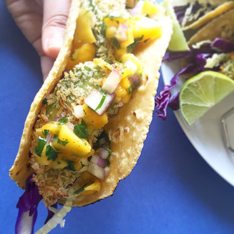 7. Assemble your tacos as soon as the avocados are baked because these are the crispiest and most delicious right out of the oven. I like to put cabbage on the bottom, then the avocados, then the mango salsa. Last, I splash a little lime juice on top and that’s all folks!