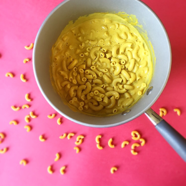 6. Now the fun part! Get yourself some Banza Chickpea pasta here or regular elbow macaroni. Bring water to a boil, add salt and olive oil. Drop in your pasta and stir every so often for 3 – 5 minutes. Yup! That’s it 3 – 5 minutes is all it takes to cook up this amazing protein packed chickpea pasta!