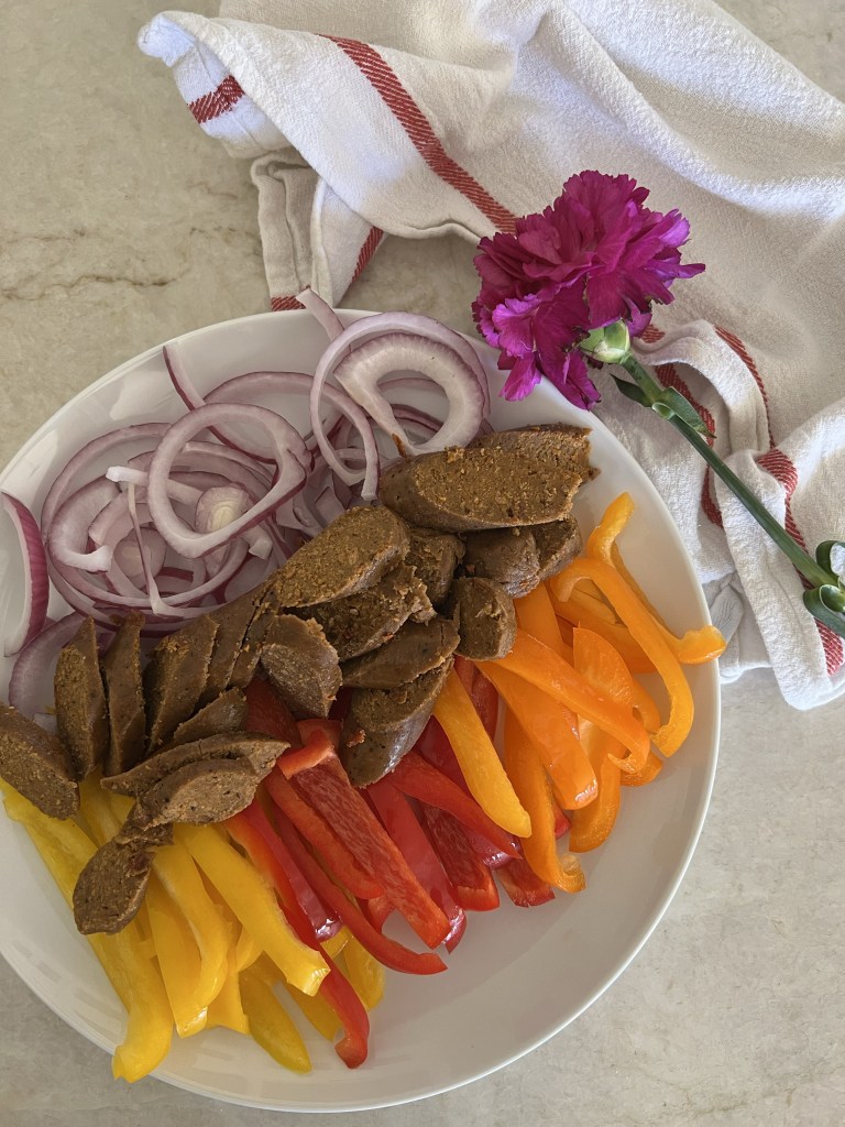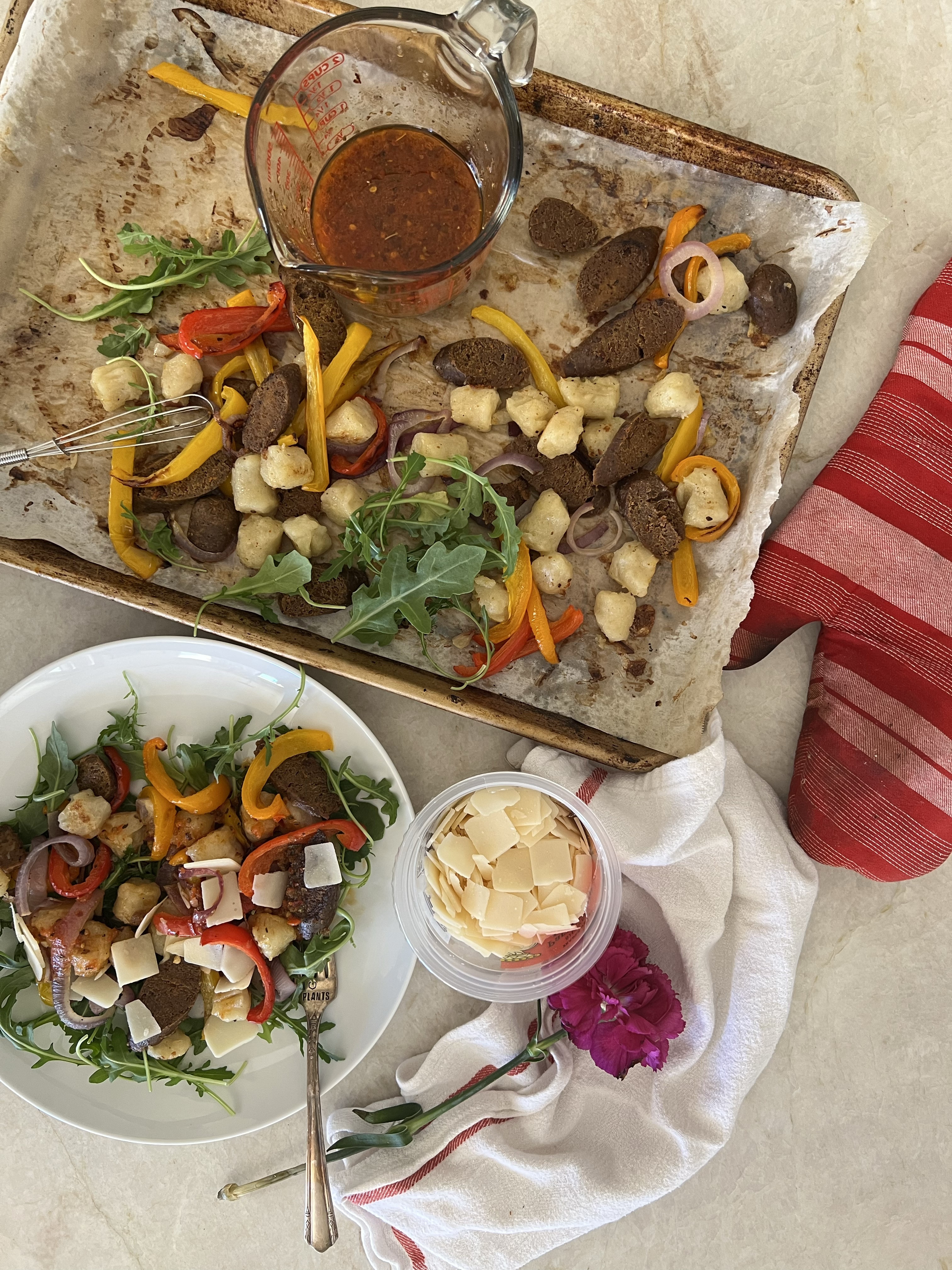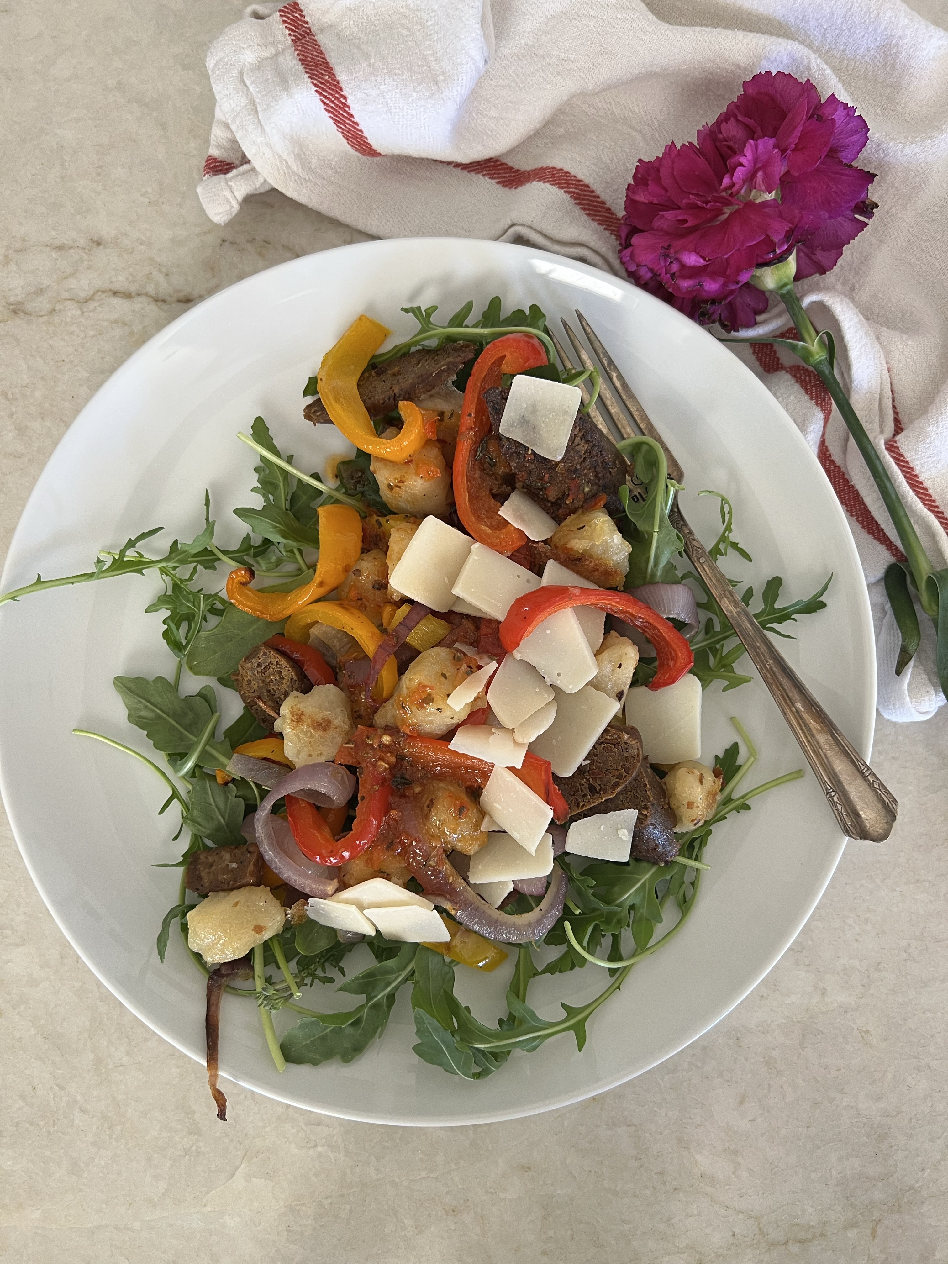 Ingredients: 2 Bell Peppers 2 Plant-based Italian Sausages (I used these) 1/2 Purple Onion 1 Bag Cauliflower Gnocchi Red Pepper & Tomato Vinaigrette: 2 Tbsp Extra Virgin Olive Oil 2 Tbsp Red Wine Vinegar 1 Tbsp Italian Hot Calabrian Pepper Sauce (This one is my fave) 1 Tbsp Marinara Sauce 1/2 Tsp Garlic Powder 1/2 Tsp Dried Oregano 1/2 tsp Dried Basil Pinch Crushed Red Pepper Serve with: Grated Parmesan – optional Arugula Today was my first “recipe creating, testing, shooting” day in a long time and it was a blast! I really hope you love this one. I’ve had it in my notes for a while and even bought peppers twice because I lagged on finally making this and the first batch of peppers had to be eaten. I’m so happy it finally came to fruition today. It did not disappoint. The hot pepper sauce was a last minute add and I am so happy I did it. It’s tangy, salty, spicy, and smooth because of the olive oil. Reminds me of a a big fat Sausage & Pepper Hoagie but fancier and more delicate. Could serve this at a dinner party or a BBQ and everyone will be pleased. I had it for lunch on a Tuesday and I already know that’s the peak of my week. Double or Triple this recipe if you have lots of mouths to feed. Leave off the dressing & give them a side of ketchup if serving to the picky kiddos. Anyway, were off for an adults only trip to Vegas this weekend and I’m very excited to say the least! I always say my two favorite things are being with my kids and not being with my kids. You feel me?! 😉Sausage & Pepper Gnocchi