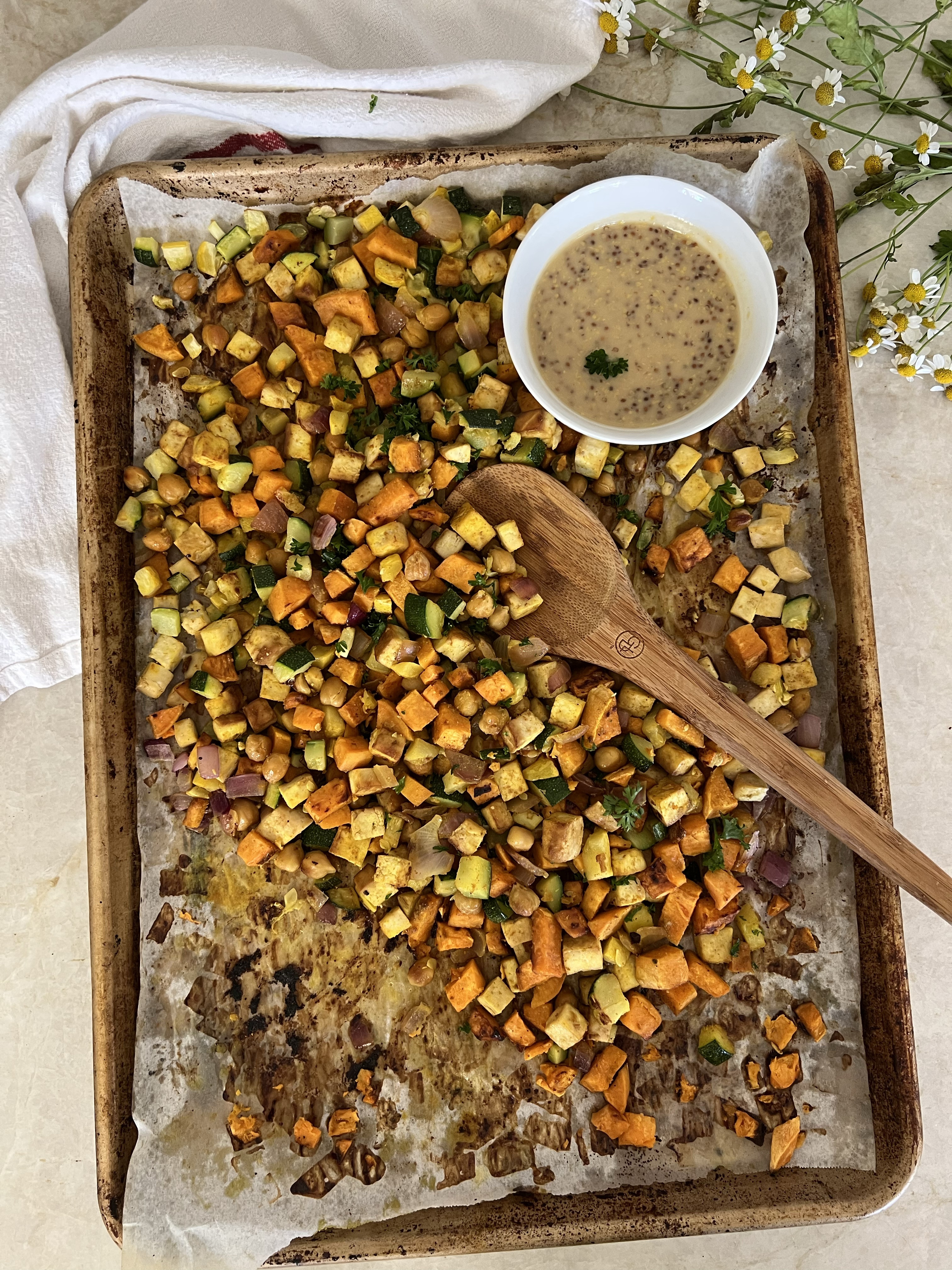 Ingredients: 2 Sweet Potatoes 3 Zucchini 1 Block SuperFirm Tofu 1 can Chickpeas 1/2 Purple Onion 2 Tbsp Extra Virgin Olive Oil 1 Tbsp Coconut Aminos Seasoning Blend: 1/4 tsp of each: Coriander, Cumin, Ginger, Garlic Powder, Turmeric, Onion Salt, Smoked Paprika, Dried Parsley 1/2 tsp of each: Salt & Pepper 1 tbsp: Nutritional Yeast Parsley garnish Maple Mustard Hummus Dressing: 2 Tbsp Whole Grain Mustard 2 Tbsp Maple Syrup 2 Tbsp Hummus Water to thin out as needed If you want the sheet pan version skip #3, 4, and 5 above and follow below instead: 3a. Preheat oven to 450 degrees f 4a. Line a baking tray with parchment paper and spread all ingredients out evenly. Top with Olive Oil, Seasoning mixture, and Coconut Aminos and mix well until everything is evenly coated. 5a. Bake in the oven for 35 – 45 minutes removing once to toss halfway through Top with fresh parsley and Enjoy!! Hippie Hash with Maple Mustard Hummus Dressing