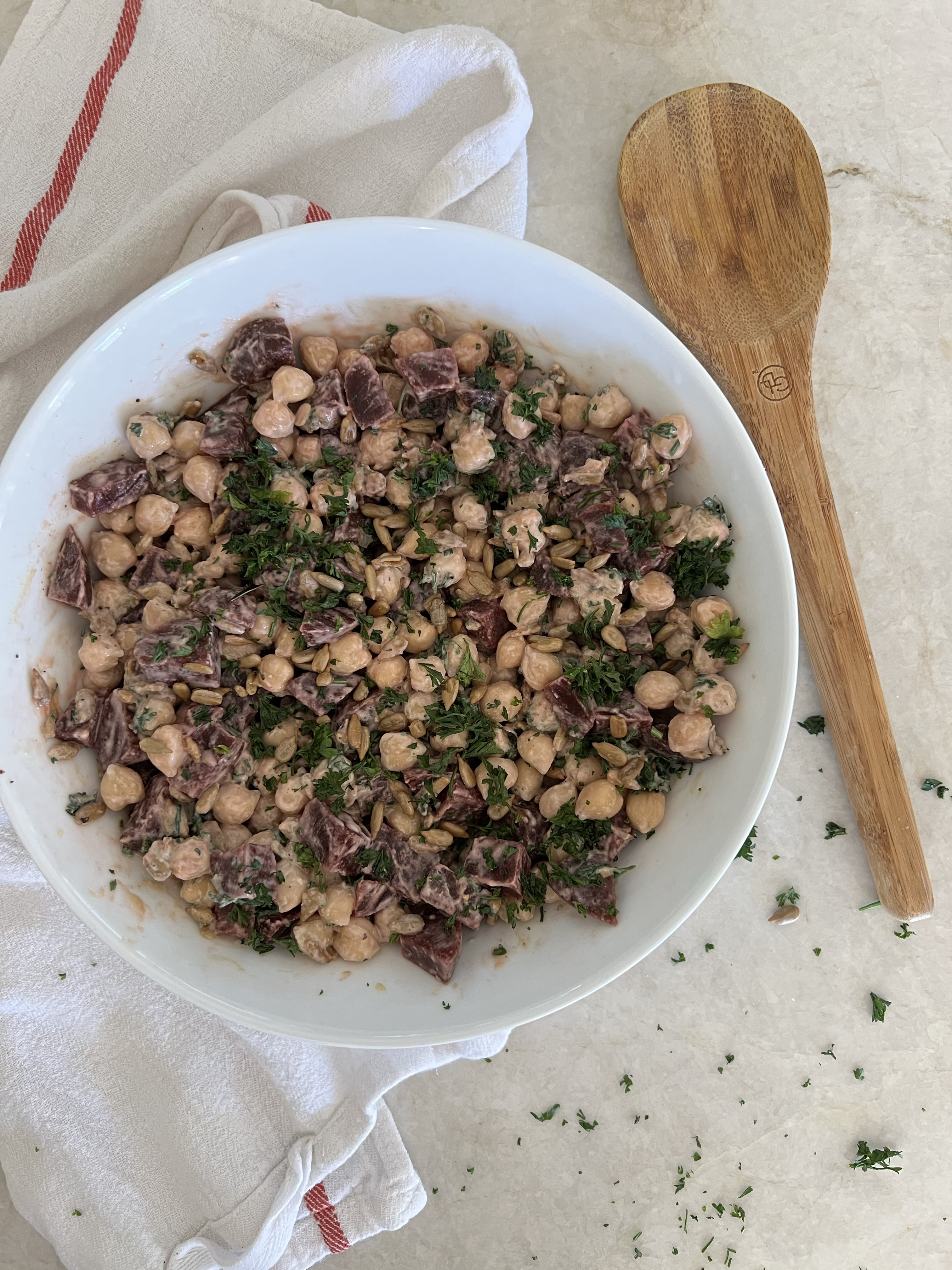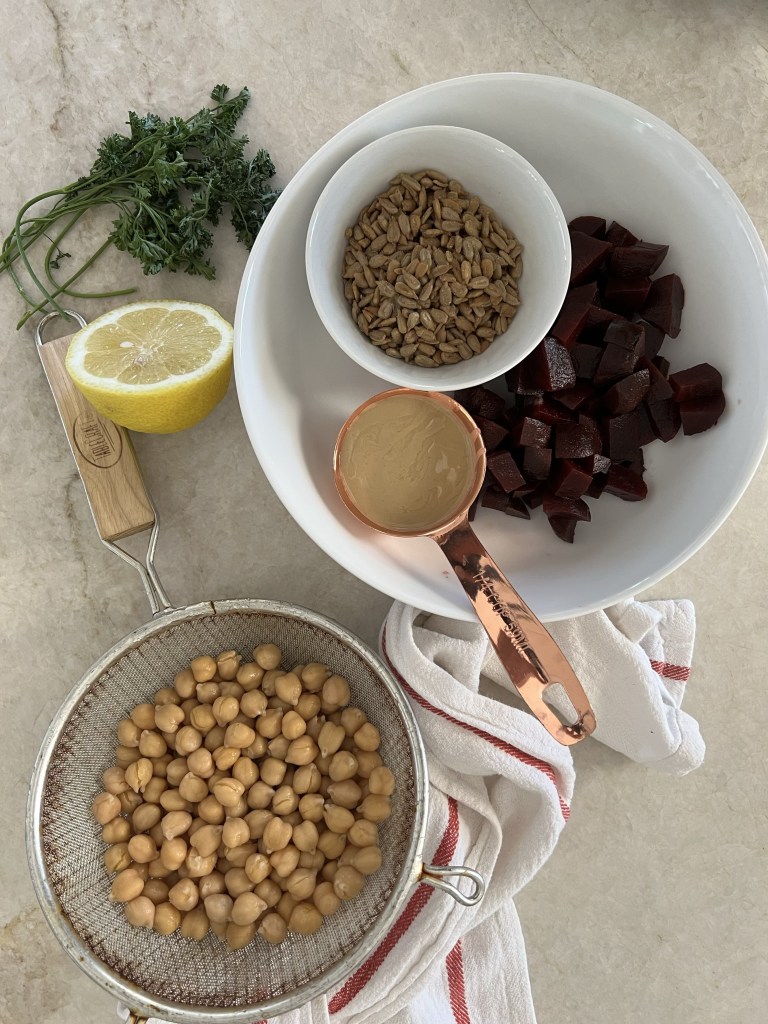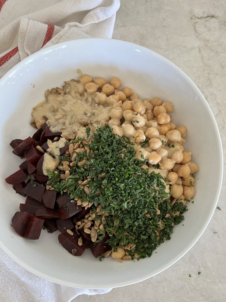 Ingredients: 1 can Chickpeas 5 Small Roasted Beets 1/2 cup Roasted Sunflower Seeds 1/4 cup Tahini 1 whole Lemon (juiced) 1/4 cup chopped Parsley Salt & Pepper to Taste Directions: Refrigerate and enjoy for up to 10 days. Beet & Chickpea Salad