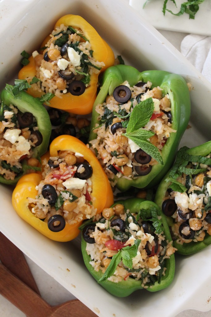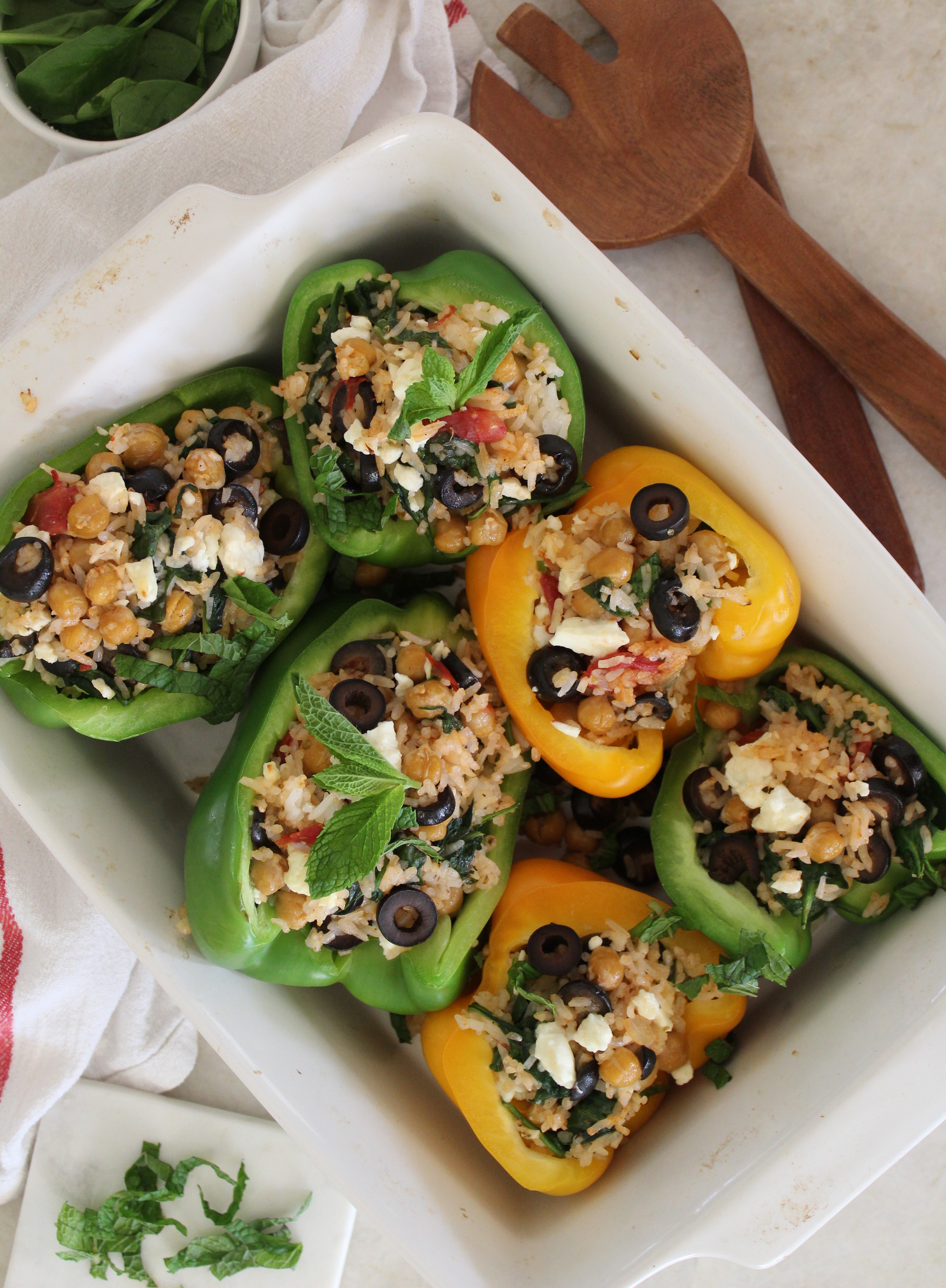 Ingredients: 3 Bell Peppers 2 Cups cooked white rice 1 can garbanzo beans 1 cup sliced black olives 1/4 cup feta cheese 1/2 cup marinara sauce 2- 3 handfuls fresh spinach Salt, Pepper, Oregano to taste Directions:Greek-Style Stuffed Peppers