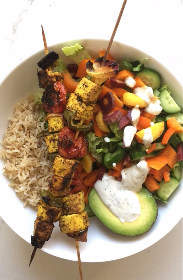 Dinner was spectacular!!! I reheated those Tofu Kabob Skewers in the oven and paired it up with some leftover rice, tons of veggies and I even made vegan Tzatziki sauce using Kite Hill Plain Almond yogurt + a tsp of Apple Cider Vinegar + a tsp of dry dill. OH EM GEE. So Delish!! If you haven’t tried the Tofu Kabob recipe from last week, WHAT ARE YOU WAITING FOR??